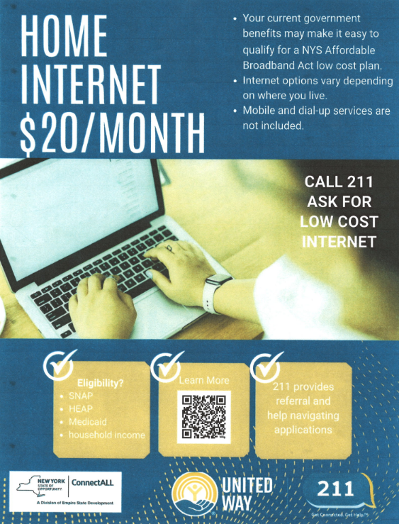 Reminder: Affordable Broadband Available to Income-Qualified HouseholdsNew Yorkers can sign up for home internet for $15-$20/month, inclusive of fees and taxes, if their household participates in f...